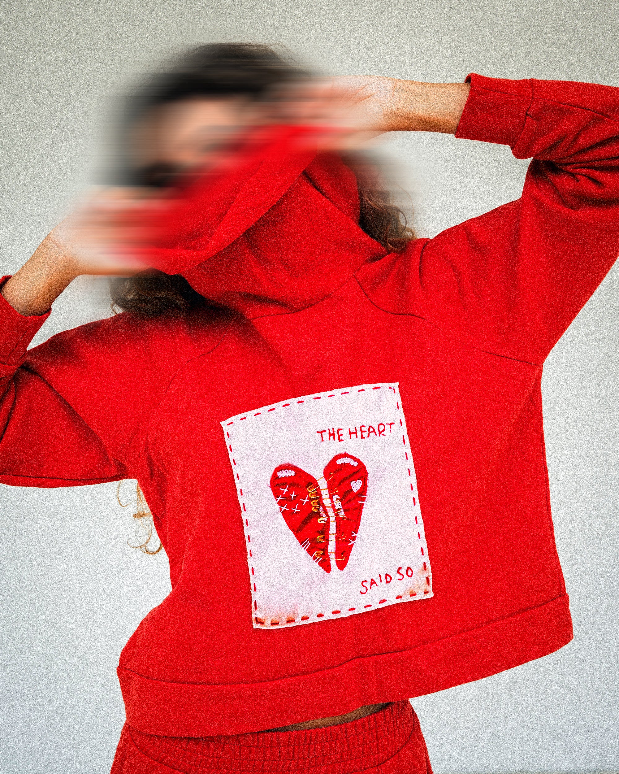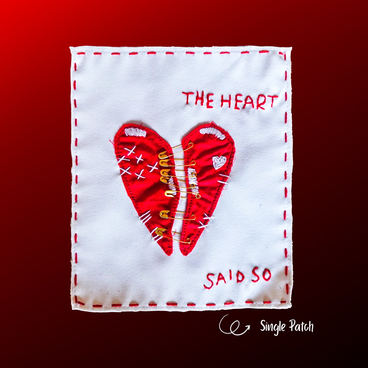 This patch is entirely made by hand — from the hand-embroidered stitches to the way the heart is secured with safety pins, one at a time.